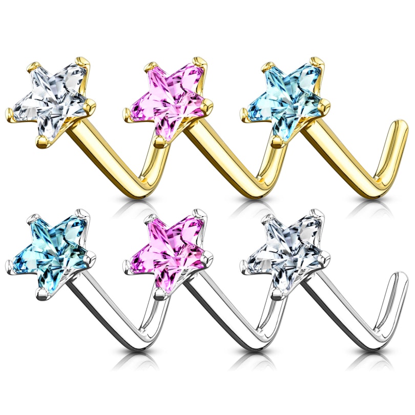 Brilla come una stella con questo piercing al naso bello e femminile dotato di una magnifica e brillante pietra a forma di stella. La stella è stata intagliata con molte facce così può brillare quando viene colpita dalla luce, indipendentemente da quale angolo questa provenga. Questo taglio è lo stesso che si pratica nel mondo dei diamanti. Puoi scegliere questa bella pietra a stella in tre diversi colori. C'è la pietra trasparente che ha uno stile e un aspetto più pulito mentre la pietra di colore rosa ha un aspetto femminile per te che non ti stanchi mai di questo tratto della tua personalità e per ultimo la pietra turquoise che ha un aspetto affascinante.