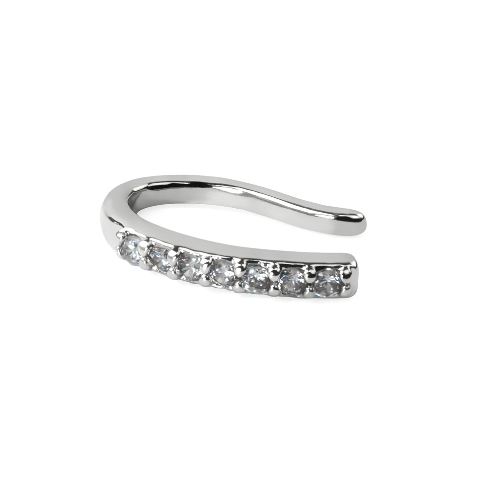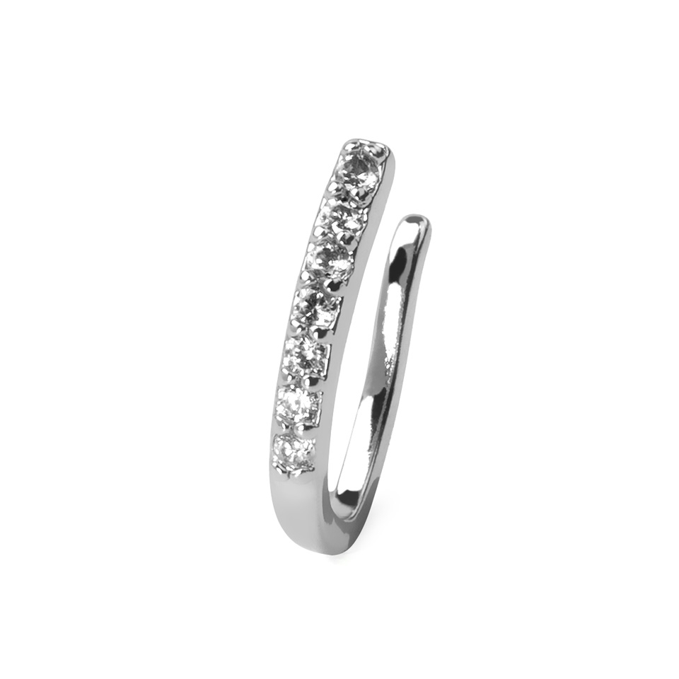 Lo spessore di questo piercing falso è pari a circa 1 mm ed è decorato con una fila di sette zirconi chiari. Non dovendo entrare in un buco da piercing, il gioiello è realizzato interamente in ottone, placcato poi in questo splendente grigio brillante.