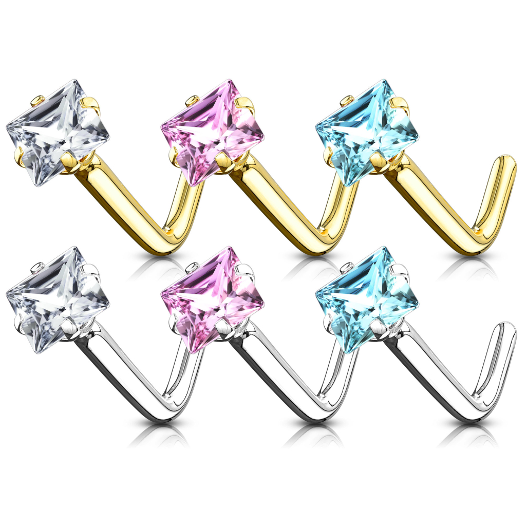 Scegli liberamente tra i due colori che sono disponibili ognuno con tre diversi colori sulla pietra quadrata. C'è la classica pietra trasparente che rende un gioiello perfetto per molti outfit e molte occasioni. Comunque puoi avere questo dolce gioiello per il naso con una pietra rosa chiaro oppure turquoise, versioni che donano extra brillantezza al gioiello, attraendo maggiormente lo sguardo. La scelta è tutta tua e se ti sbrighi a ordinare questo gioiello oggi puoi presto indossarlo nel tuo naso.