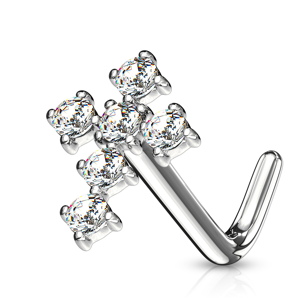 Come puoi vedere dall'immagine e come accennato prima, c'è una croce sul davanti del gioiello, fatta di ben 6 gemme. Le gemme sono zirconi cubici e sono sempre chiari indipendentemente dal colore dell'asta che scegli. La croce è alta 5,8 mm e larga 4,3 mm.