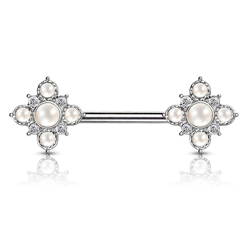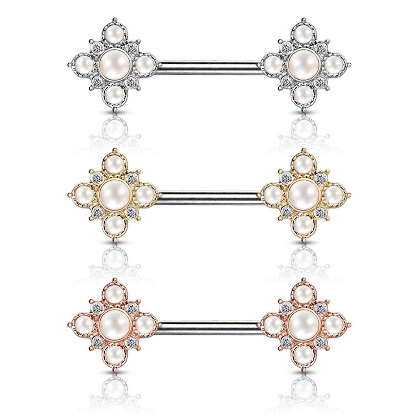 I gioielli che vedi nella foto sopra sono per chi ha un piercing al seno In breve, il gioiello è costituito da un'asta in acciaio chirurgico lunga 12 mm tra le due pietre. Alle due estremità ci sono due fiore. Usando l'immaginazione la pietra più grande corrisponde al centro del fiore mentre quattro pietre più piccole rappresentano i petali.