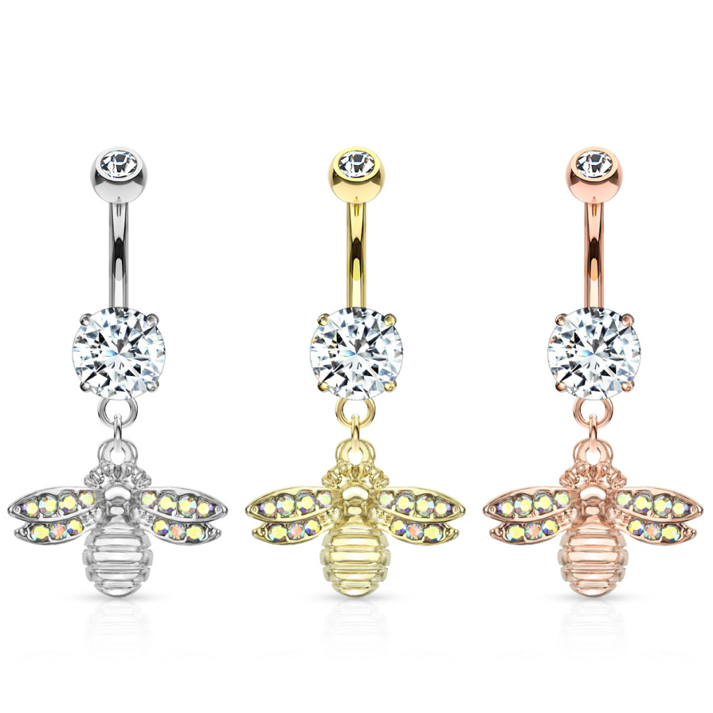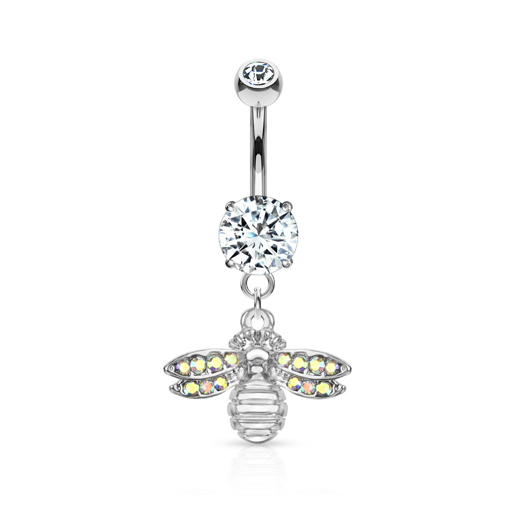 Il piercing all'ombelico che vedi qui in alto presenta un piccolo ciondolo a forma di ape. L'ape è realizzata in ottone e le sue ali hanno numerose piccole pietre che riflettono i colori dell'arcobaleno. Le chiamiamo aurora borealis perché ricordano le luci dell'aurora. L'ape pende da una barra curva lunga 10 mm con uno spessore di 1.6 mm. E' realizzata in acciaio chirurgico, come molti dei gioielli da piercing che troverai in negozio.