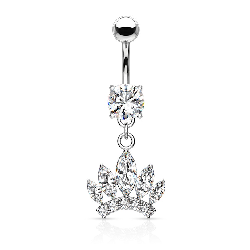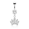 Diventa una principessa o un principe (perché no!?) quando indossi questo dolcissimo piercing all'ombelico con ciondolo a forma di corona. La stupenda corona che vedi è ricca di pietre: la parte superiore è formata da cinque pietre lunghe in cui quella centrale è la più alta, mentre sotto troverai una fila di piccole pietre rotonde.