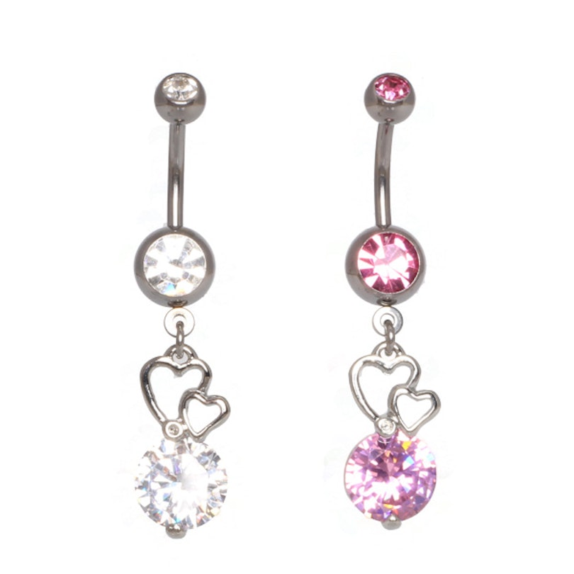 Decora il tuo ombelico con questa delizia disponibile in due colori. Il piercing è incredibilmente bello in entrambe le varianti. Presenta una barra con due pietre incastonate sulle sfere superiore e inferiore ed ha poi un ciondolo con due adorabili cuori e una grande gemma all'estremità inferiore