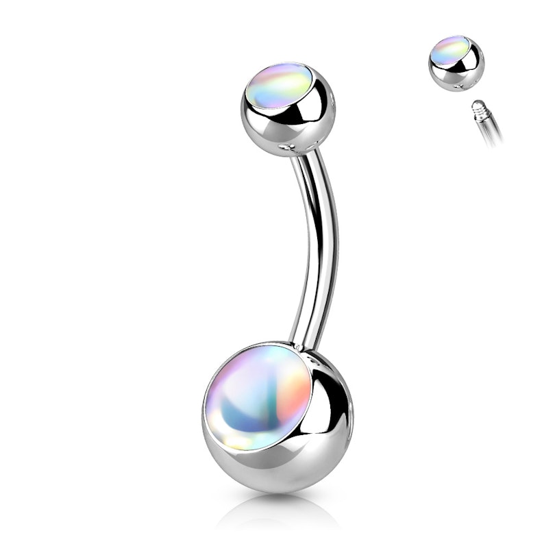 L'hai già vista nelle bolle di sapone o nelle chiazze d'olio sull'acqua: la superficie incredibilmente lucida che cambia colore mentre l'oggetto si muove è qualcosa di affascinante, quasi ipnotico, da guardare. Ed è proprio questo che succede con il gioiello per ombelico che vedi qui. Le pietre nelle sfere superiore ed inferiore cambiano colore come benzina su una superficie d'acqua. Dato che possiamo solo mostrarti una foto, non riusciamo a farti vedere l'effetto dal vivo, dovrai guardarlo di persona mentre muovi il gioiello da un lato all'altro. Quindi, se indossi questo gioiello all'ombelico, l'effetto sarà visibile con i tuoi movimenti.