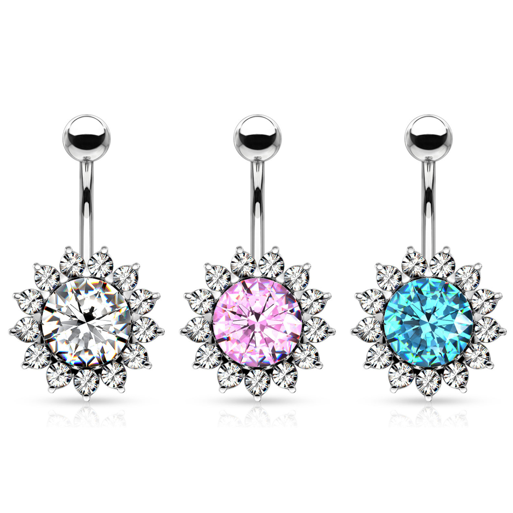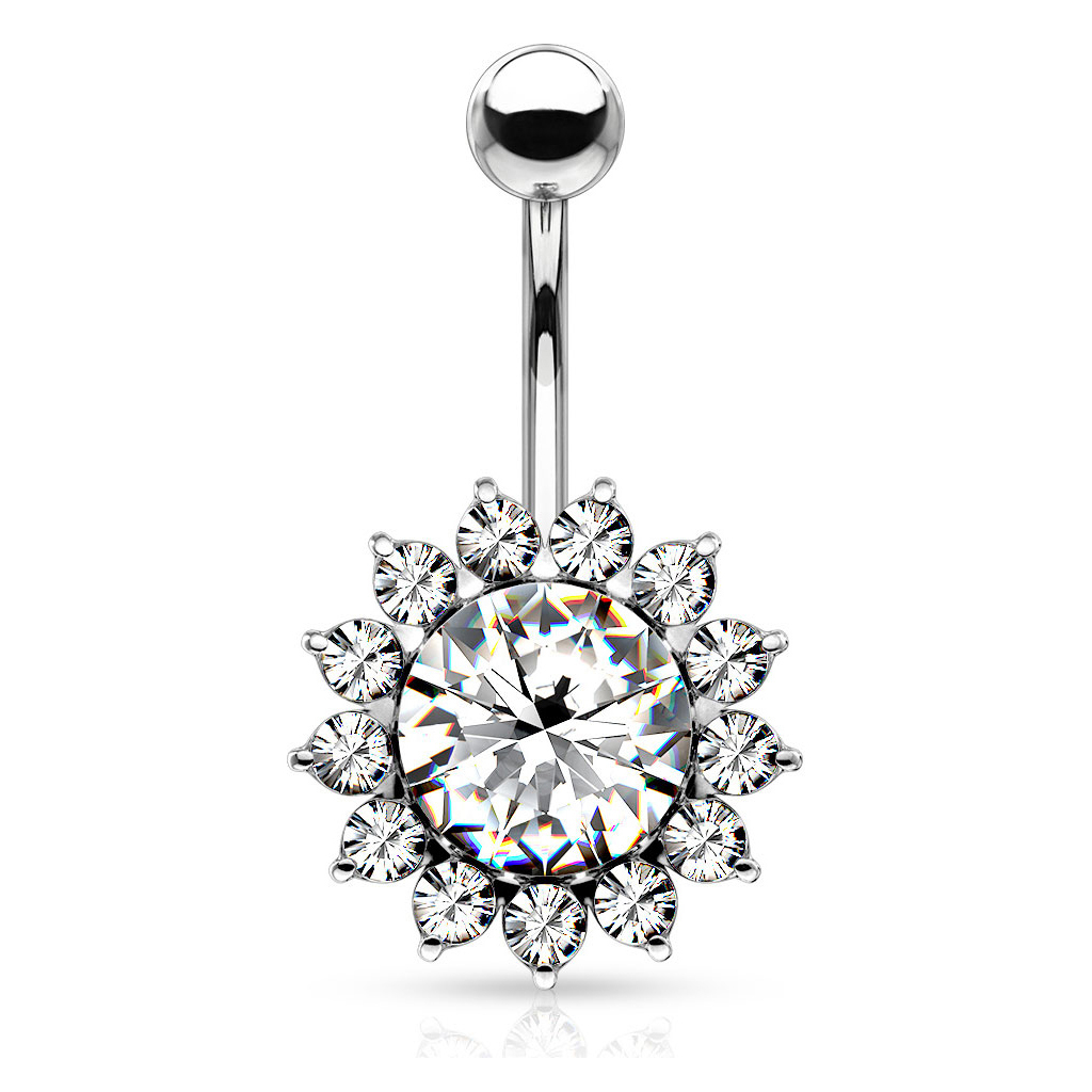 Questo piercing all'ombelico presenta una bellissima gemma nella sfera inferiore, super luminosa grazie alla sua grandezza. Attorno a questa pietra grande ci sono altre pietre più piccole che rappresentano i petali del girasole. Ricorda infatti un dolce girasole, dal look sognante.