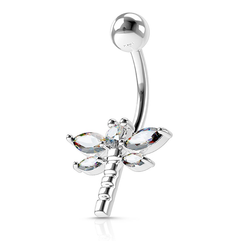 Incredibilmente trendy, questo piercing all'ombelico presenta una bellissima libellula con pietre trasparenti. Ha le misure standard dei piercing all'ombelico ed è fatta di acciaio chirurgico, un materiale molto sicuro che non rilascia nichel.