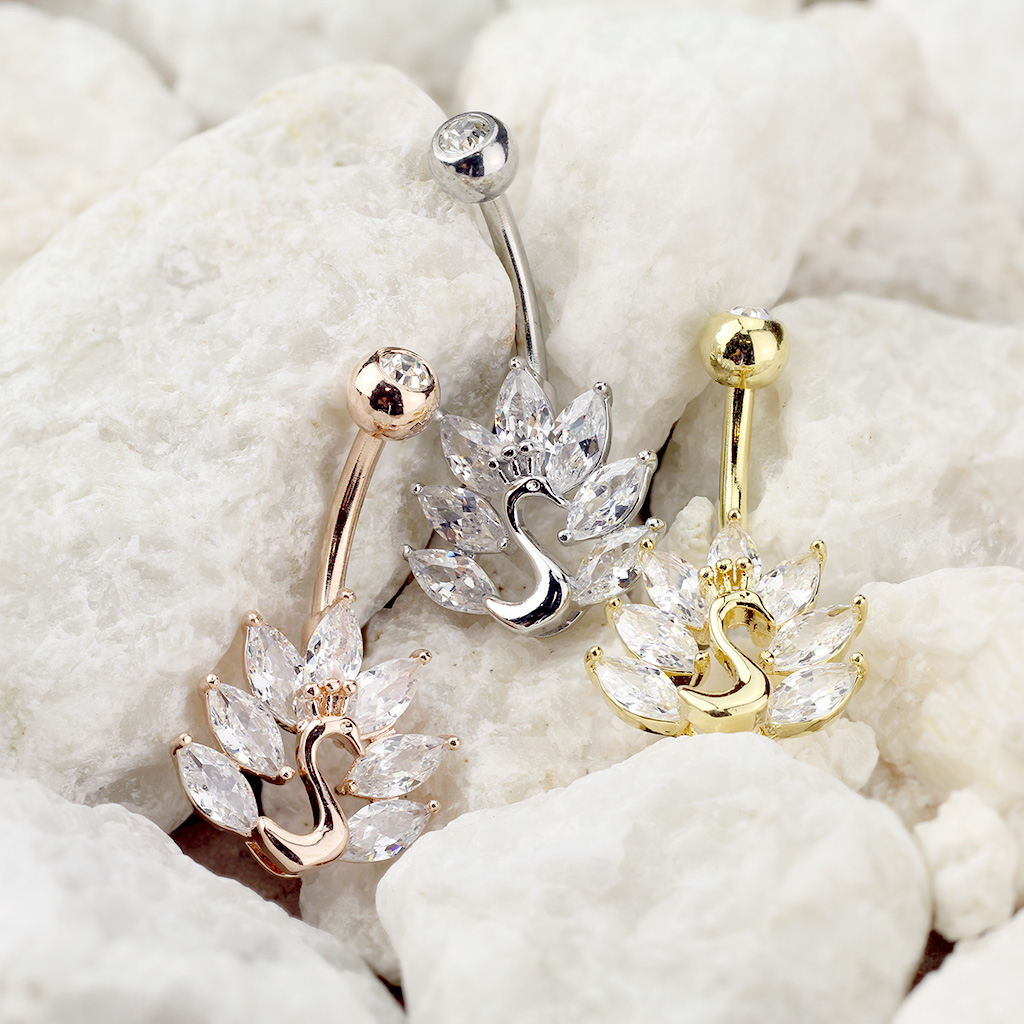 Il piercing all'ombelico che vedi nell'immagine soprastante è decorato con un bellissimo pavone. La coda del pavone è a sua volta abbellita da fantastiche pietre che hanno un taglio davvero particolare. In totale ci sono 7 fantastiche pietre a decorare l'uccello.