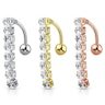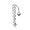 Il gioiello che vedi nell'immagine sopra ha un'asta curva in acciaio chirurgico. Nella parte inferiore del gioiello si trova la sfera che normalmente dovrebbe trovarsi nella parte superiore, ma dal momento che si parla di un piercing all'ombelico inverso è normale che tutto sia al contrario. Infatti, il pendente che di solito si trova nella parte inferiore, ora si trova in quella superiore. Tutto questo fa si che questo gioiello sia adatto ad un piercing che si trova nella parte inferiore dell'ombelico, ma in realtà puoi usarlo anche in un normale piercing. In questo caso le pietre sporgeranno appena sopra l'ombelico e copriranno sia l'asta, si ala sfera e l'ombelico.