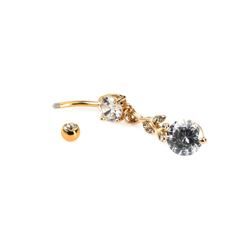 I gioielli piercing funzionano meglio quando sembrano un po più vivi. Questo è particolarmente vero per questo piercing all'ombelico, come si può anche vedere nella figura appena sopra questo testo che stai leggendo. Il gioiello è caratterizzato da un ciondolo che è stato modellato in modo tale da assomigliare ad un ramo di foglie. Sia le foglie e i rami sembrano dare vita al gioiello. Nella parte inferiore del ciondolo c'è una grande pietra cubica di zircone- oltre a questa è presente un'altra pietra nascosta nella sfera superiore, una grande e rotonda posta nella sfera inferiore e piccole pietre sulle foglie del ciondolo. Non puoi di certo dire che questo gioiello non ha delle pietre. Quelle nella parte inferiore del ciondolo sono bloccate tramite dei bracci di presa molto piccoli che trattengono la pietra e assicurano che non cada.
