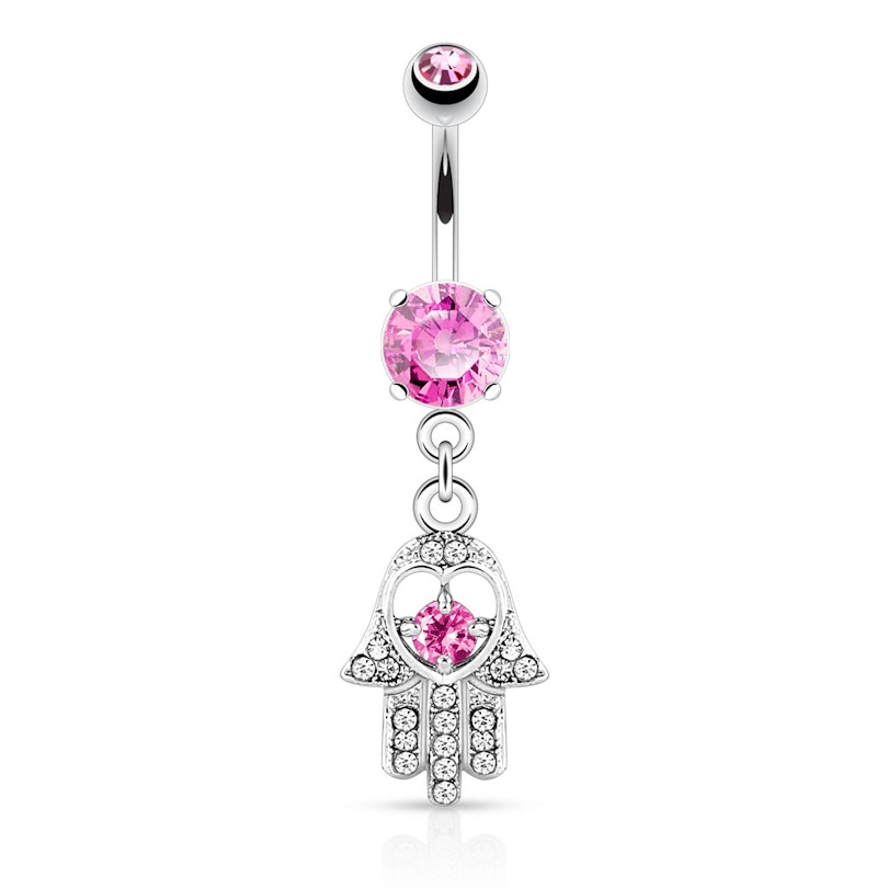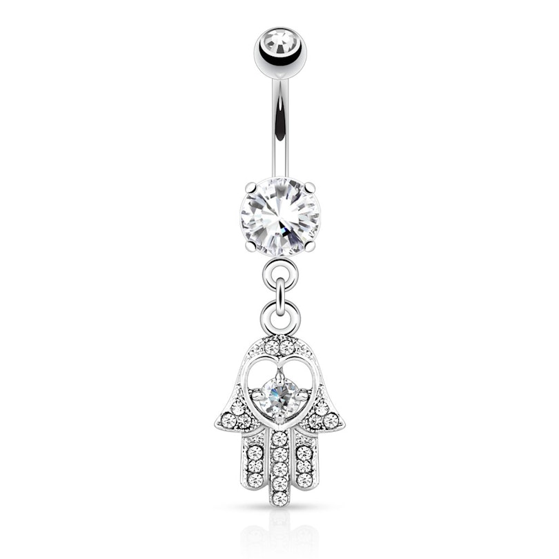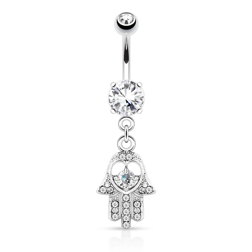 Qui hai la possibilità di comprare un fantastico piercing all'ombelico con mano hamsa nel pendente. La mano hamsa è un antico simbolo proveniente dal Medio Oriente dove è stato utilizzato come amuleto protettivo per quelli che lo indossavano sul corpo. Per questo stesso motivo, la mano hamsa è anche diventata molto popolare nei gioielli.