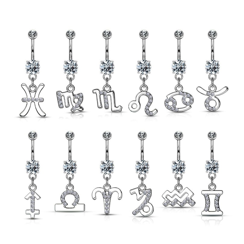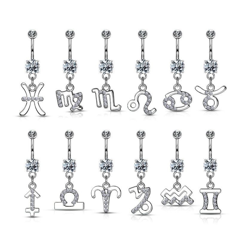 Indossa uno stupendo gioiello per piercing all'ombelico con pendente del tuo segno zodiacale. Puoi scegliere il tuo segno o quello della persona a cui vuoi più bene: tutti i gioielli sono decorati con splendide pietre chiare.