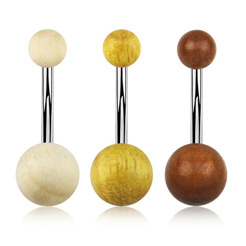Tuttavia, questo gioiello non è interamente realizzato in legno in quanto l'asta è in acciaio chirurgico, ma essendo nascosta nell'ombelico, puoi vedere solo le sfere.