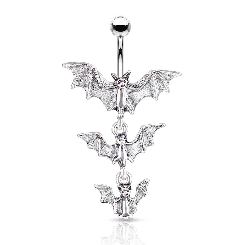 Questo gioiello è realizzato in acciaio chirurgico. I tre pipistrelli sono ordinati in base alla grandezza, col più grande in cima e il più piccolo alla base. Il pipistrello più grande poggia anche sulla sfera inferiore, mentre gli altri due sono posizionati sotto come pendenti. Ciò creerà un piacevole dinamismo in quanto i pipistrelli in basso oscilleranno da un lato all'altro coi movimenti del tuo corpo.