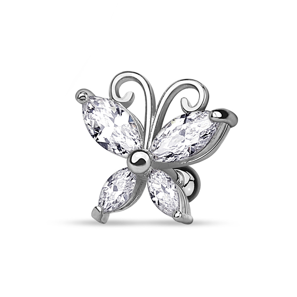 È davvero difficile non amare questa dolcissima e graziosa farfalla, soprattutto quando è così ben costruite, come nel caso di questo bel piercing all'orecchio. La farfalla su questo gioiello è composta da quattro magnifiche ali, ognuna delle quali è decorata da brillanti pietre trasparenti. Le ali superiori sono leggermente più grandi di quelle inferiori, il che rende questa farfalla un'ottima imitazione di una reale.