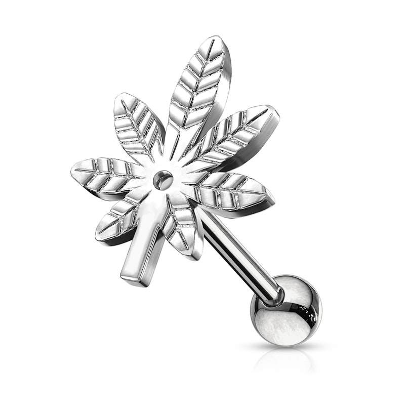 Questo splendido gioiello consiste in una barra dritta lunga 6 mm che presenta una bellissima foglia su una delle estremità. Possiamo immaginare si tratti di una foglia di canapa, a giudicare dalla forma. Non volendo promuovere l'uso di cannabis non diremo che si tratta di una foglia di marijuana per evitare discussioni. :)