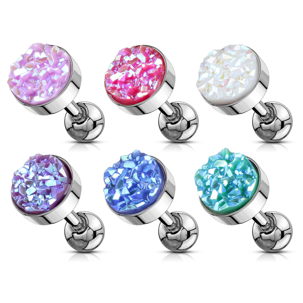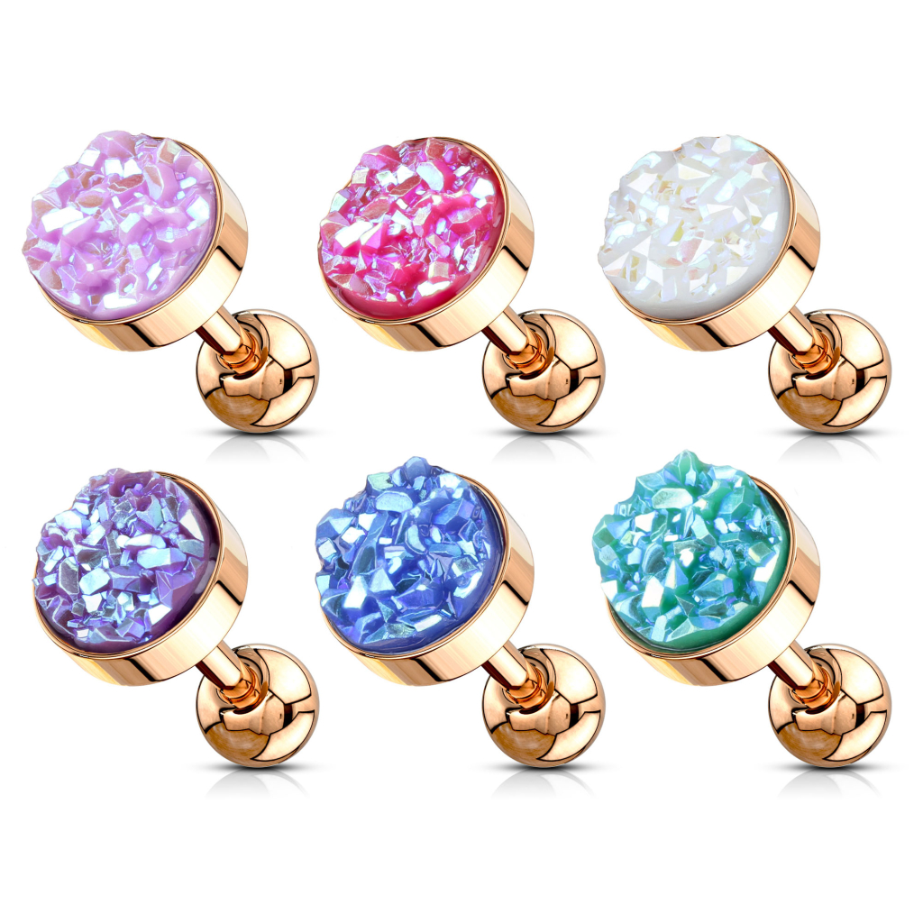 Qui si ottiene un piercing all'orecchio piccolo e discreto con una grande personalità. Il gioiello misura 6 mm. A lungo termine, ha una palla in alto con lo stesso obiettivo, ma quello che è nella palla in alto conferisce al gioiello una grande spinta di vedetta. La palla in alto è stata equipaggiata con il nome di una pietra druzy, che non è una pietra ma una superficie più vicina di piccoli cristalli.