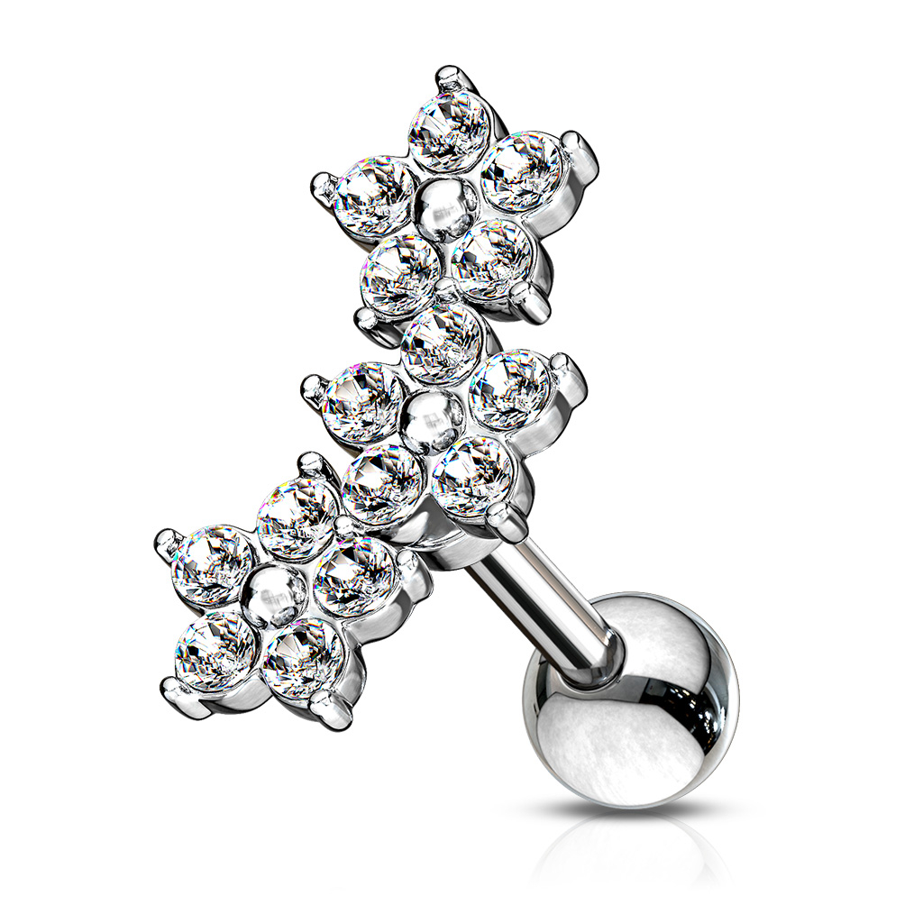 Piercing all'orecchio con tre fiori in pietra posti in fila