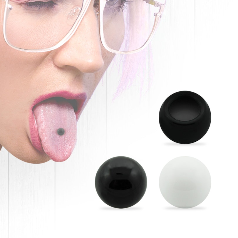 Nella fotografia soprastante puoi vedere un piercing alla lingua finto. Essendo un piercing finto, non richiede un buco da piercing per essere utilizzato. Però è allo stesso tempo un articolo perfetto per vedere se un piercing alla lingua è adatto a te. Il gioiello è disponibile in due colori, bianco e nero. La sfera è fatta d'acrilico ed è dotata di una cavità. Questa cavità è pensata per creare un effetto ventosa che serve al piercing finto per stare fisso sulla lingua.