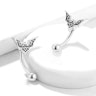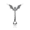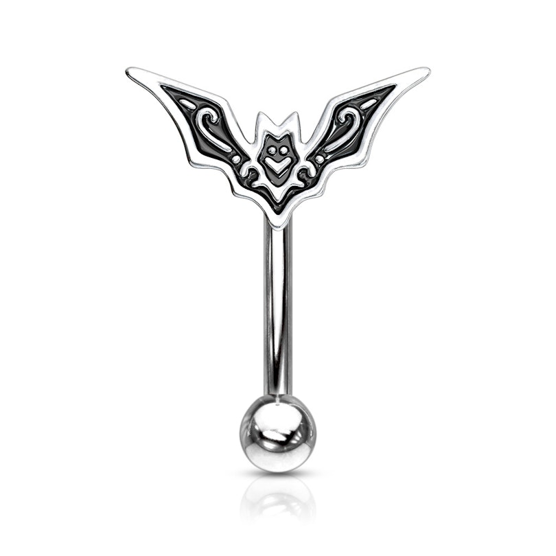 La parte superiore della barra presenta un pipistrello simmetrico con ali sparse. Sotto le due orecchie provocanti si possono facilmente distinguere due occhi e un grande sorriso.Nella parte inferiore è presente una sfera di 3 mm (1/8").Il pipistrello è realizzato in ottone e successivamente rivestito con un tipo di rodio ossidato.Il resto dei gioiello è realizzato in acciaio chirurgico.