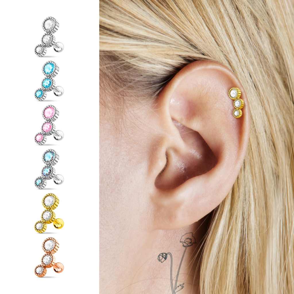 Piercing helix con 3 pietre rotonde in diverse misure