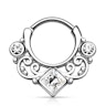 Un septumclicker è un gioiello pensato apposta per il septum che si chiude e si apre semplicemente con un piccolo click. La piccola barra viene inserita oppure tirata fuori dallo stesso cerchio quando il gioiello deve essere inserito oppure tirato fuori. La barra ha una forma leggermente curva e questo permette allo stesso cerchio di trovarsi leggermente più in basso, senza stare troppo attaccato al naso. Insomma, stiamo parlando di un gioiello davvero bello, decorato con pietre e intrecci che fanno il loro effetto.