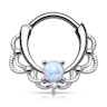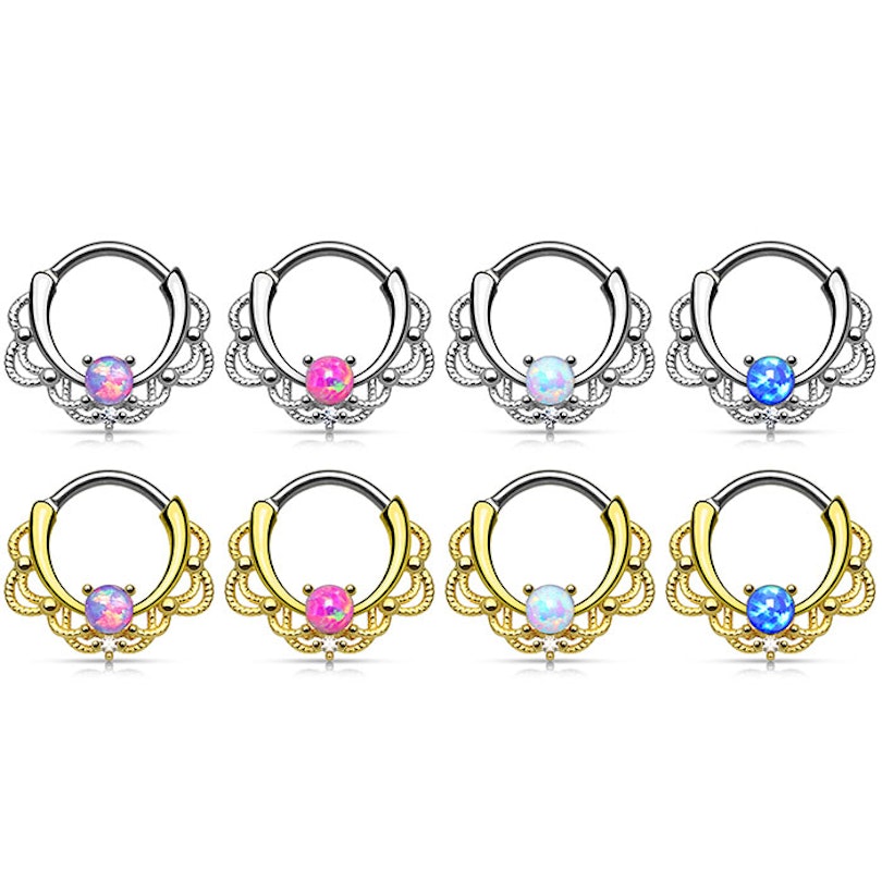 Lo stesso gioiello è stato pensato in un fantastico stile a catena, con fili che si sovrappongono nella parte esterna del cerchio. Le catene iniziano dal centro del gioiello, sotto alla pietra opale dove si trova un'altra piccola pietra trasparente. Questo gioiello ha uno stile davvero bello e grazioso che sarà amato da qualsiasi ragazza che ha un piercing del genere.