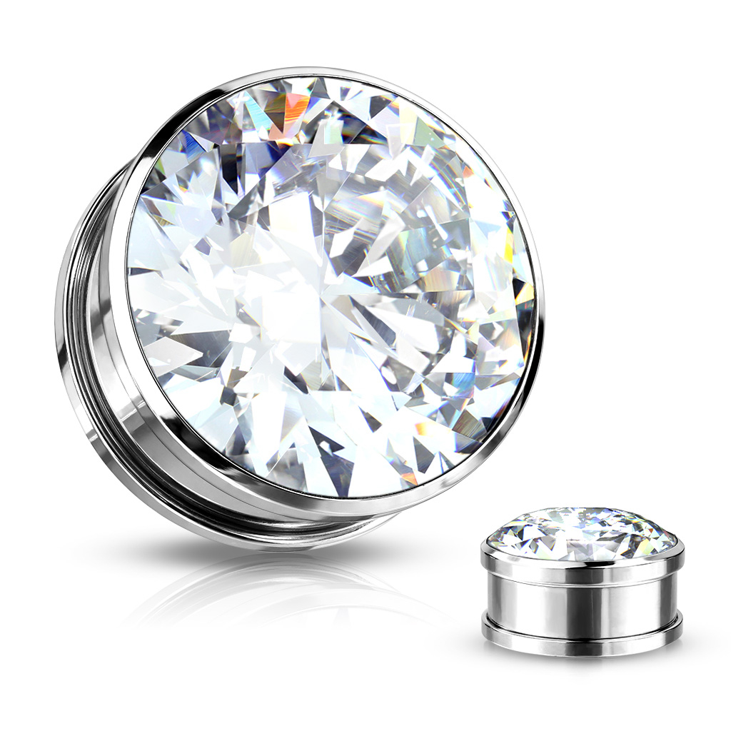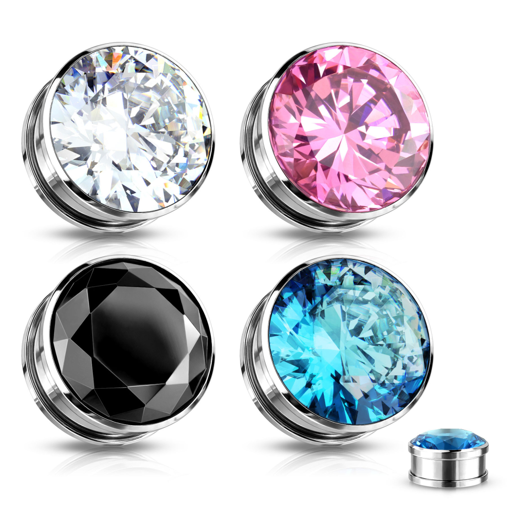 Questo plug è fatto in acciaio chirurgico ed è disponibile in 4 diversi colori e molte più grandezze in base a quanto avanzato sei nella tua dilatazione. Nella parte frontale del gioiello siede una pietra di colore vivace intagliata a forma di diamante così come si può vedere già dalla misura più piccola del plug. Questo plug viene inserito nell'orecchio grazie alla filettatura che si trova nella parte posteriore, il che lo rende molto facile da inserire. Inoltre il plug in sé è davvero comodo da indossare perché è leggero.