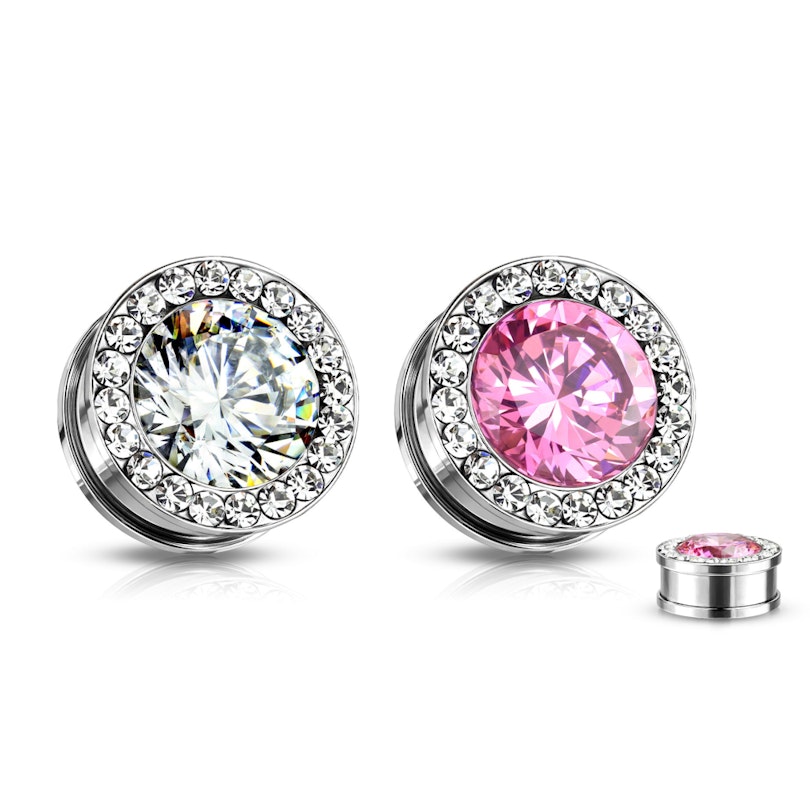 É realizzato in acciaio chirurgico e ha una filettatura nella parte posteriore, che lo rende molto leggero. La parte davanti presenta una grande gemma del colore che preferisci, circondata da tante piccolissime pietre. Scegli il diametro della dilatazione: più è grande, più pietre ci sono.
