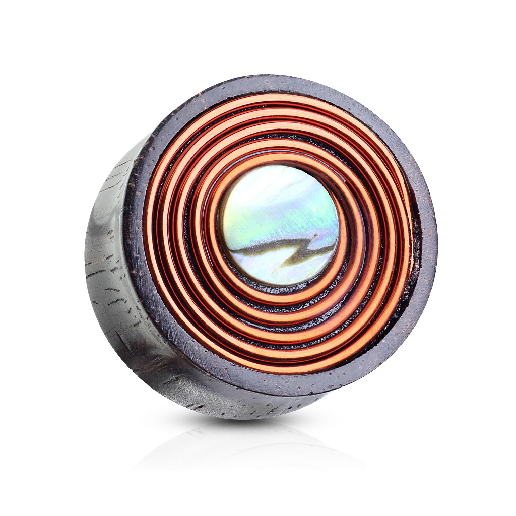 Il plug che stai vedendo è anche questo realizzato in materiale organico: il legno. Il gioiello è disponibile in diverse dimensioni, da 10 mm fino a 25 mm per quanto riguarda il diametro e ovviamente non è un gioiello per coloro che dilatano per la prima volta il proprio buco. Nella parte frontale del gioiello c'è una piccola pietra di madreperla nel centro, circondata da un filo di rame. Sembra un po strano se leggi la descrizione senza vederne una foto ma questo gioiello dal vivo risulta essere molto bello.