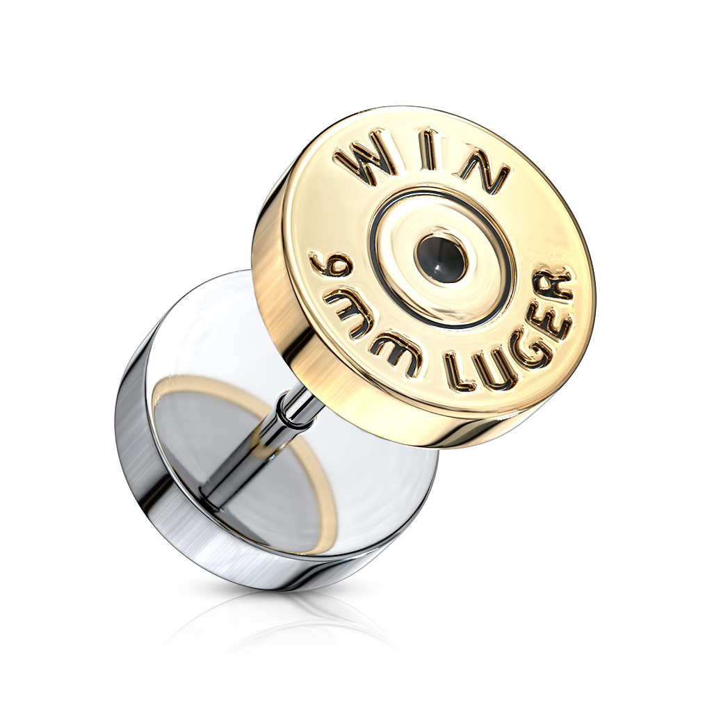 Quello che vedi qui è plug fake con disegnato il retro di una cartuccia. La ragione per cui parliamo di un plug fake è che lo puoi indossare in un piercing standard, ovvero di 1,2 mm, senza bisogno di alcuna dilatazione. Non è proprio possibile vedere la differenza tra un vero plug e questo, una volta indossato! Il diametro è di 10 mm, misura che serve a rendere il testo ben visibile, come su una vera cartuccia - non sarebbe così cool senza il testo.