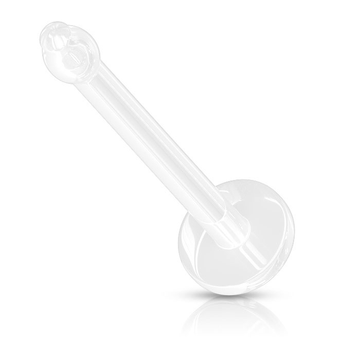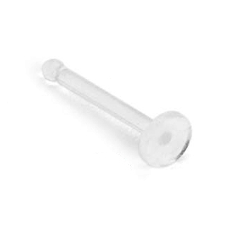 Questo retainer per naso è fatto in plastica trasparente e consiste in una barra spessa 0,8 mm. e lunga 7. Nella parte posteriore di questa barra si trova una piccola sfera, leggermente più spessa del resto della barra. La sfera funziona come un gancio che mantiene il retainer nel proprio posto ed evita che questo cada. Dalla parte opposta, ovvero nella parte frontale del gioiello, si trova un piccolo piatto con un diametro di 2 mm. Le dimensioni di questo piatto non sono molto grandi per fare in modo che possa sdraiarsi sulla superficie del naso, senza attrarre l'attenzione.