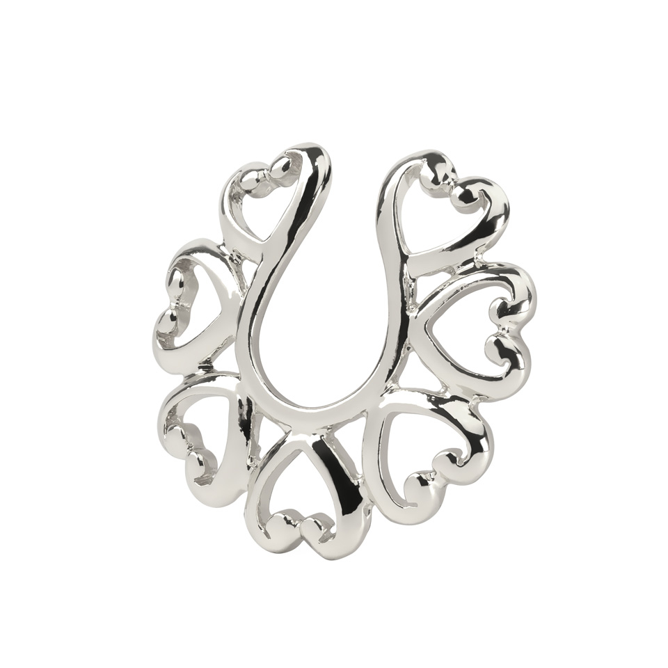 Stai pensando a farti un piercing al capezzolo ma non sai deciderti? Prova a vedere come ti starebbe prima di prendere una decisione. Questo è uno scudo fake per capezzolo con una sequenza di delicati cuori che fanno da contorno.