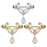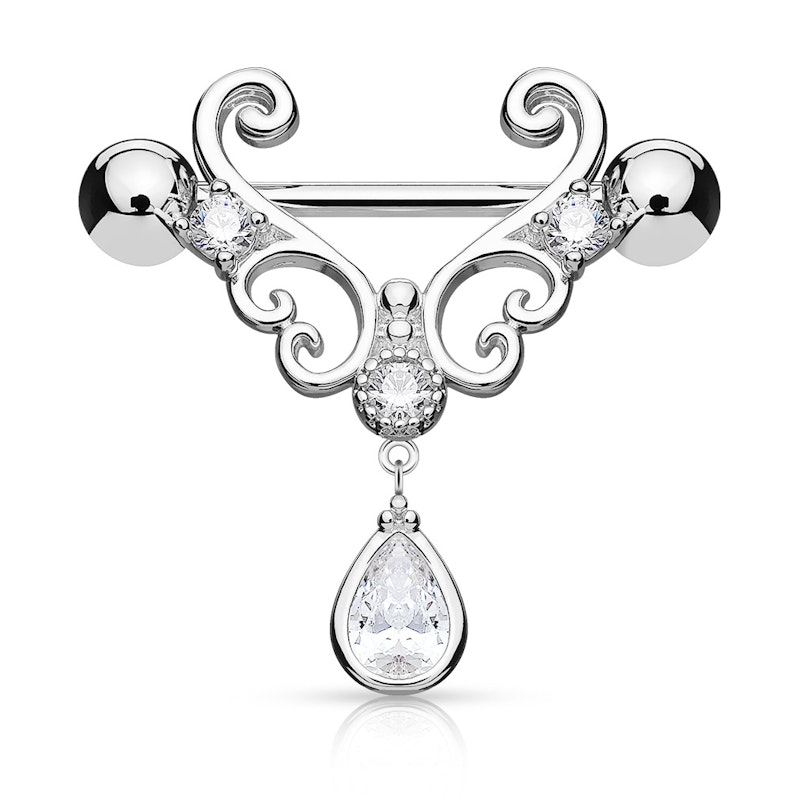 Questo gioiello è molto più bello quando si trova nel tuo piercing al capezzolo. Il cuore è rotto nella parte superiore e si riconnette in quella inferiore. Seguendo il cuore mentre si va verso il basso, questo finisce per trasformarsi in una bella pietra trasparente decorata da altri due piccoli cuori. Nella parte inferiore del grande cuore si trova un'altra pietra bellissima pietra a forma di goccia in un pendente che è la ciliegina sulla torta di questo gioiello. Questa pietra sembra rappresentare una goccia che cade dal cuore stesso, creando un simbolo molto romantico.