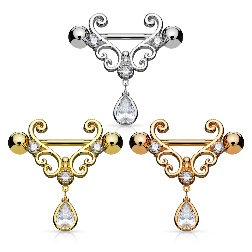Questo gioiello è molto più bello quando si trova nel tuo piercing al capezzolo. Il cuore è rotto nella parte superiore e si riconnette in quella inferiore. Seguendo il cuore mentre si va verso il basso, questo finisce per trasformarsi in una bella pietra trasparente decorata da altri due piccoli cuori. Nella parte inferiore del grande cuore si trova un'altra pietra bellissima pietra a forma di goccia in un pendente che è la ciliegina sulla torta di questo gioiello. Questa pietra sembra rappresentare una goccia che cade dal cuore stesso, creando un simbolo molto romantico.