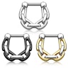 Questo gioiello viene comunemente chiamato septum clicker. Il nome deriva dal piercing per il quale viene utilizzato assieme alla modalità di apertura e chiusura. Infatti viene utilizzato nel piercing septum e si apre e si chiude con un semplice click - Da qui si ha il septum clicker.