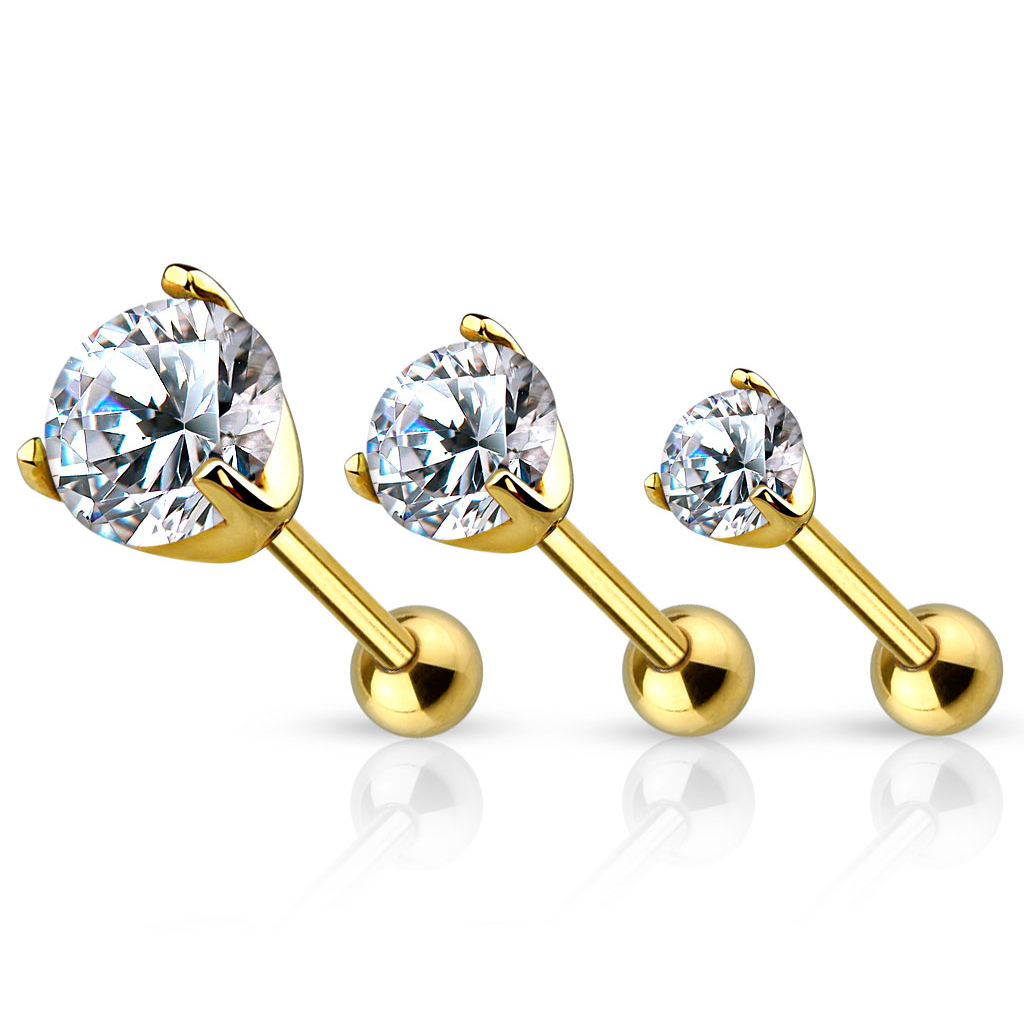Qui hai la possibilità di comprare un fantastico set di orecchini in vero oro. Questi tre graziosi gioielli per orecchio hanno tutti un diametro del filo di 1,2 mm. e si adattano perfettamente ai piercing fatti con l'ago. Ognuno di essi è dotato di una bella pietra trasparente. Tutte le pietre hanno misure diverse: 2 mm, 3 mm.e 4 mm.