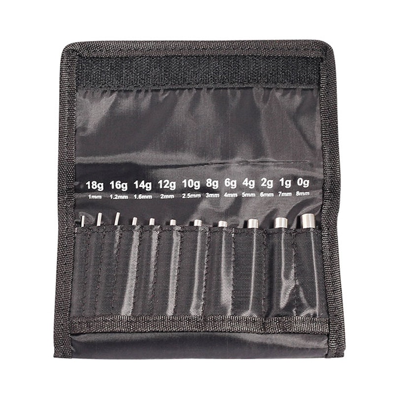 Nel modello piccolo ci sono tapers che vanno da 1 fino agli 8 mm. di dilatazione. Il modello grande ha tapers che vanno dai 10 fino ai 20 mm. Aspetto comune a entrambi i modelli sono le cavità per dilatatori presenti nella parte posteriore di ogni dilatatore. Per questo motivo, ad esempio, il taper da 10 mm. ha in effetti la parte posteriore di un diametro pari a 11 mm perché c'è un bordo che trattiene il gioiello. Grazie a questa cavità hai la possibilità di inserire in un colpo solo sia il taper che il futuro gioiello dilatatore che desideri indossare.