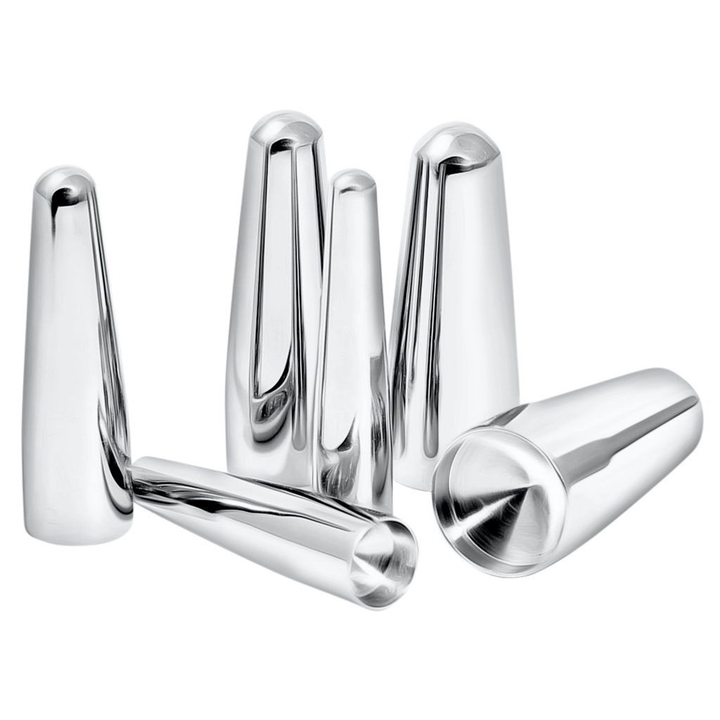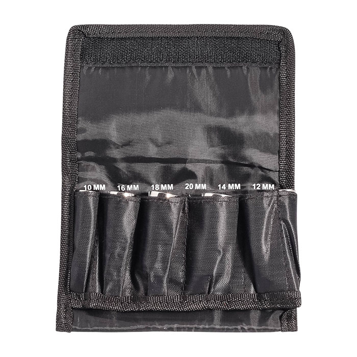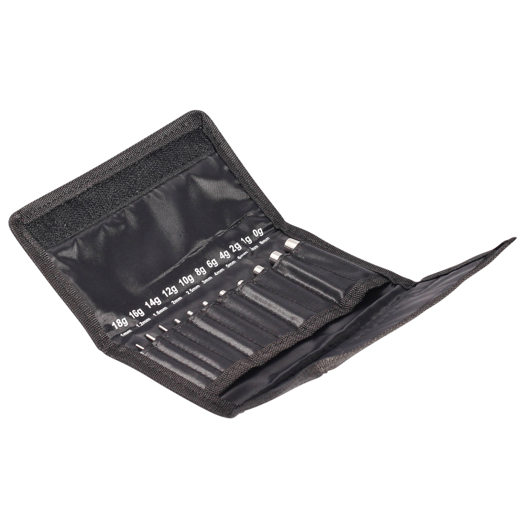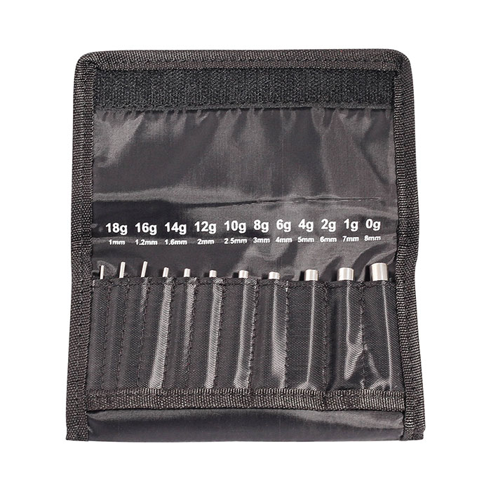 Nel modello piccolo ci sono tapers che vanno da 1 fino agli 8 mm. di dilatazione. Il modello grande ha tapers che vanno dai 10 fino ai 20 mm. Aspetto comune a entrambi i modelli sono le cavità per dilatatori presenti nella parte posteriore di ogni dilatatore. Per questo motivo, ad esempio, il taper da 10 mm. ha in effetti la parte posteriore di un diametro pari a 11 mm perché c'è un bordo che trattiene il gioiello. Grazie a questa cavità hai la possibilità di inserire in un colpo solo sia il taper che il futuro gioiello dilatatore che desideri indossare.