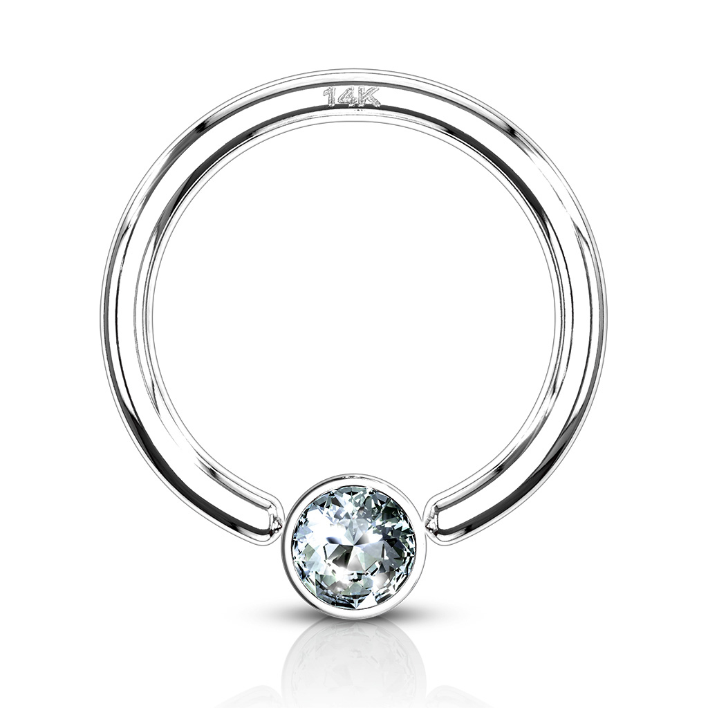 Ti presentiamo qui un delizioso cerchio con sfera, o captive bead ring, realizzato in splendido oro 14K e con brillante pietra chiara incastonata. Non solo avrai un prodotto di alta qualità, ma anche un cerchio dal tocco delicato e dallo stile senza tempo.
