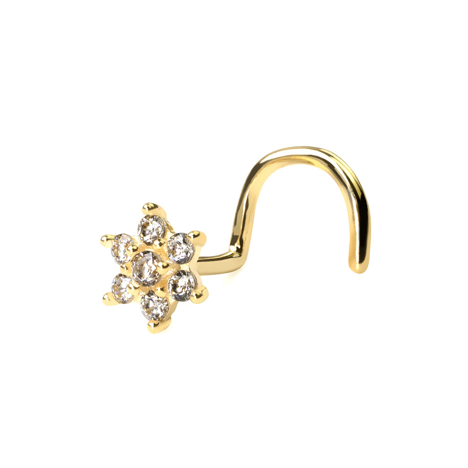Questa vite da naso d'oro 14K è dotata di un dolcissimo fiore nella sua parte anteriore. Il fiore è stato creato mettendo insieme 7 piccole pietre, sei delle quali formano un cerchio e la settima si trova nel centro del fiore. Tutte le pietre sono tenute al loro posto da piccoli tentacoli. Non è stato utilizzato quindi nessun tipo di colla che si potrebbe dissolversi e questo lascerebbe cadere le pietre.