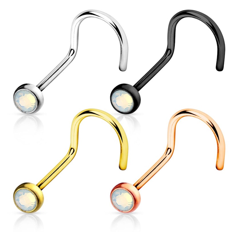 Sei alla ricerca di un nuovo gioiello perfetto per il tuo piercing al naso? Allora dai un'occhiata a questa dolcissima vite da naso con una pietra opale sulla punta. La vite da naso può essere un'ottima alternativa ad una semplice barra da naso, dato che siede nel piercing in modo fermo e non ha parti pungenti all'interno del naso che potrebbero essere un pericolo. La vite da naso viene inserita nel piercing seguendo le forme naturali del gioiello. Può sembrare un po' difficile all'inizio ma appena ti accorgerai dei vantaggi, non potrai fare a meno di questo gioiello.